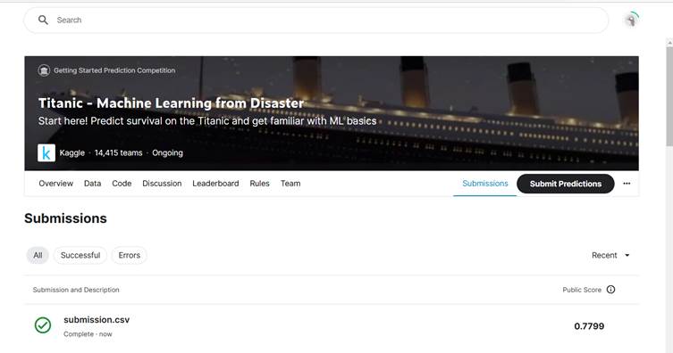 After submitting the generated csv file in Kaggle website, I got a final score of 0.7799 which is slightly higher than the original 0.77511